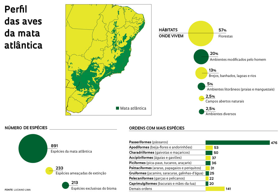 - A mata atlântica apresenta 891 espécies de aves;