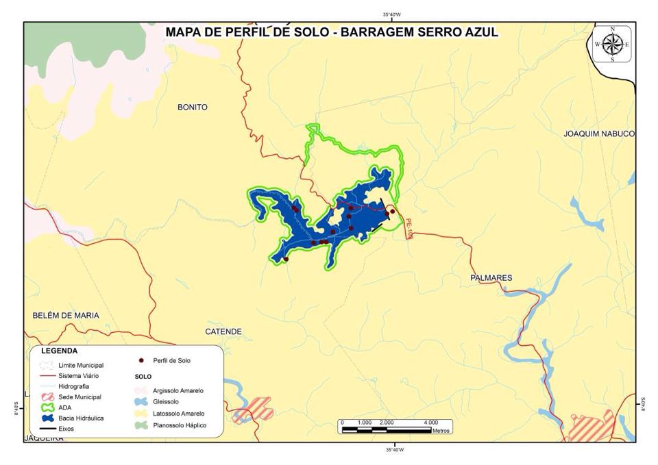 Os solos localizados na area do empreendimento pertencentes, aos municipios de Palmares, Bonito e Catende têm uma forte relação com a geomorfologia local. Os solos encontrados são representados principalmente pela ordem dos Latossolos nos topos dos morros e em regiões mais planas que estão associadas aos Argissolos nas vertentes igremes. É prenominado a presença de Gleissolos (solos menos desenvolvidos) no fundo dos vales estreitos e nos terrenos de depósitos fluviais em porções mais baixas e planas do relevo, os Neossolos Flúvicos, que é muito comum no local.